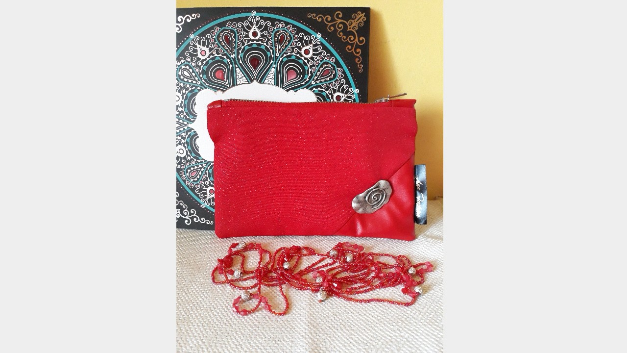Portfard *Glittery Red* din material textil cu insertie glitter argintiu foarte fin si piele ecologica